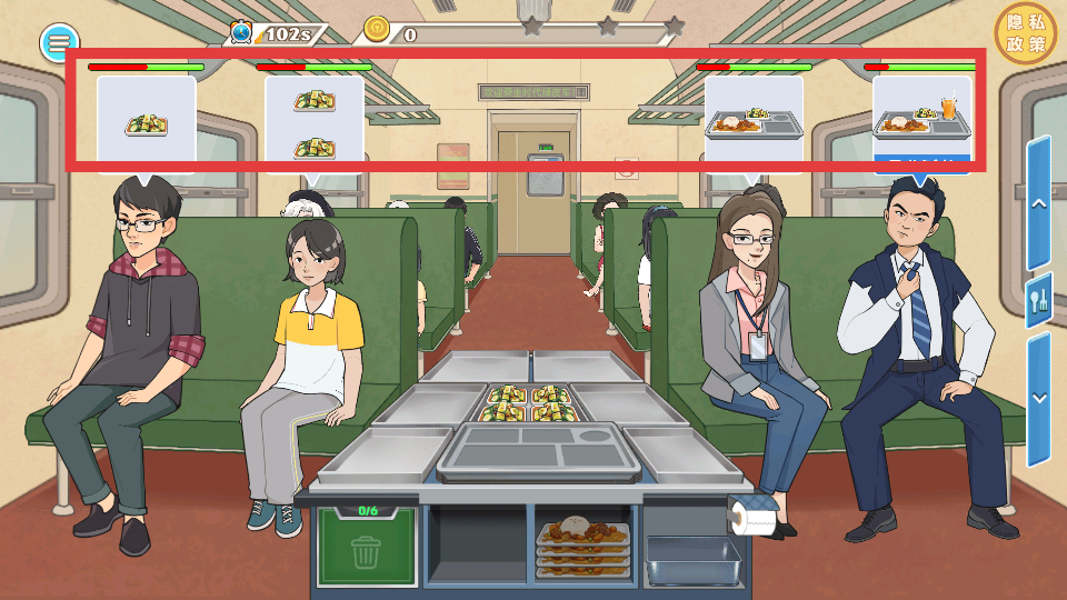 4、看到车厢上方红框内乘客需求后,快速选取对应餐食,及时满足乘客需求以获取收益。