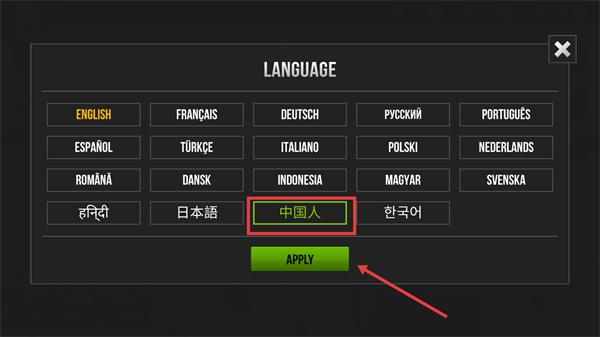 3、在语言选择界面,找到并点击红色框内的【中国人】选项,点击【APPLY】。