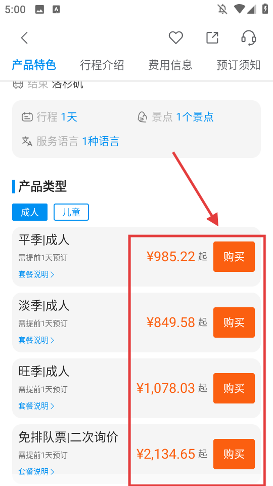 3、选择合适套餐(如淡季成人票),点击【购买】。
