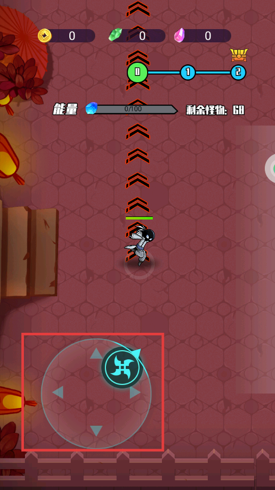 1、通过方向键【↑】【↓】【←】【→】移动角色,点击飞镖图标释放攻击,推进关卡。