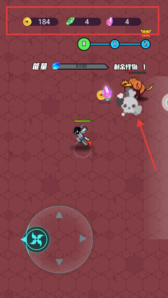 2、战斗时优先击败怪物,剩余【1】只时全力攻坚,收集掉落的【金币】【绿宝石】【粉宝石】。