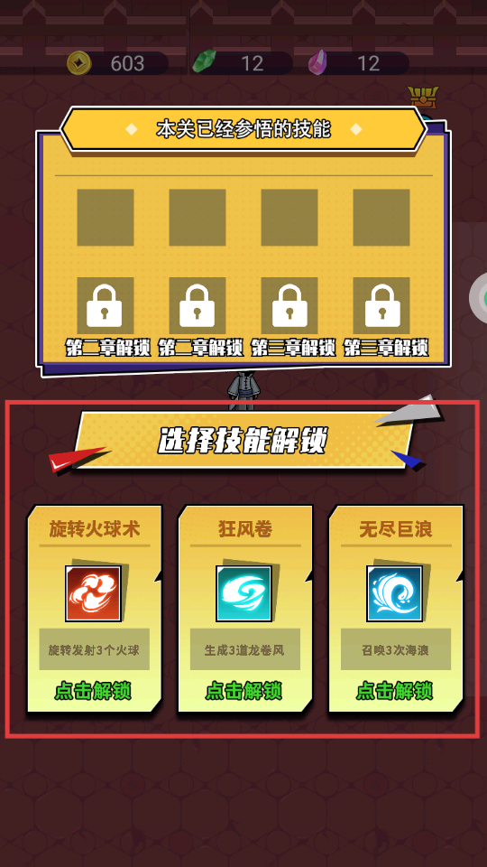 3、关卡结束后,从【旋转火球术】【狂风卷】【无尽巨浪】中选一个解锁,强化战力。