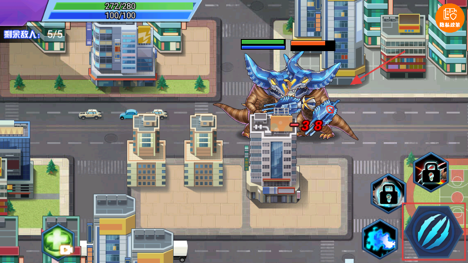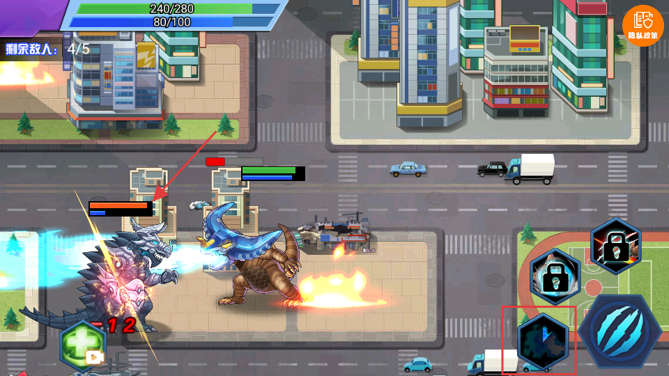 2、战斗时,利用右下角【近战技能】按钮输出,结合防守反击,关注【剩余敌人-5/5】,精准打击巨兽。