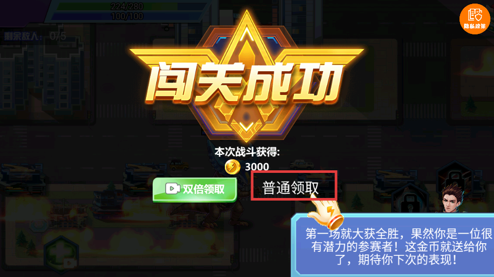 4、闯关成功后,可选择【普通领取】获取【3000】金币,积累资源用于机甲升级与定制。