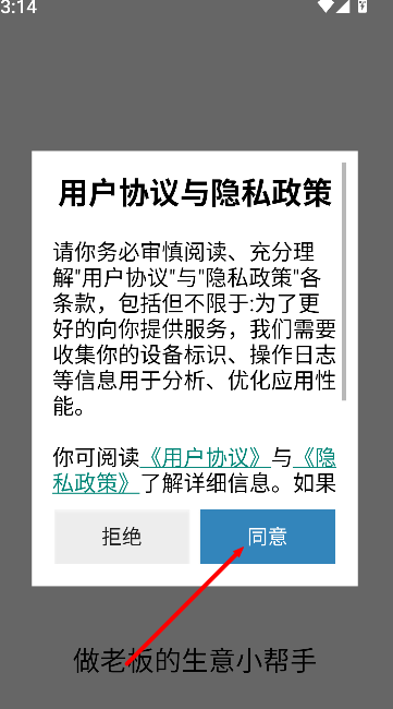 1、打开已安装的微商计算器应用,首次使用会显示隐私政策,仔细阅读后点击“同意”以进入应用首页。