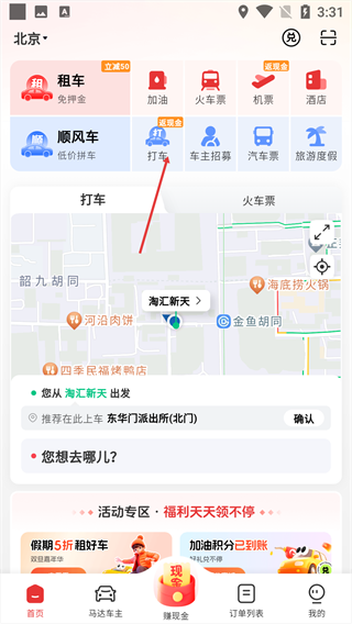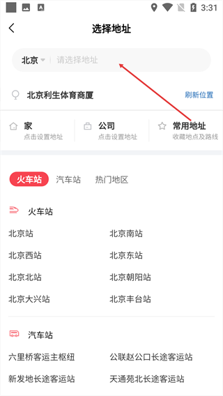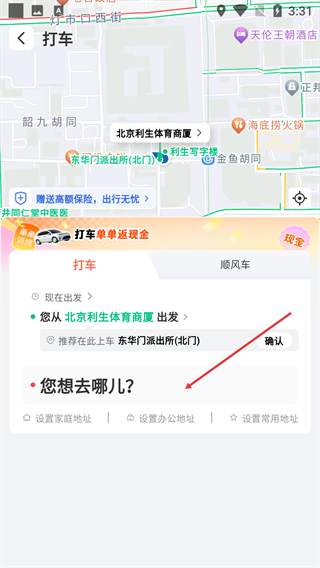 2、在打车页面点击【您想去哪儿?】输入框,进入地址选择页面。