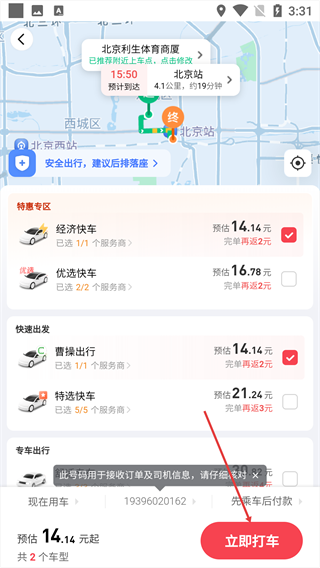 4、确认预估费用,点击【立即打车】按钮完成叫车操作。