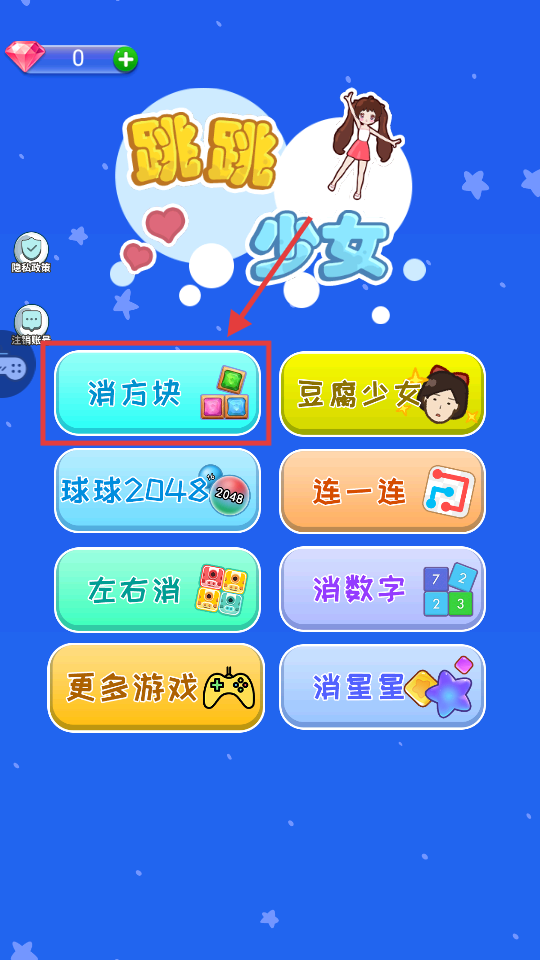 1、点击【消方块】按钮,进入消方块游戏模式,可体验独特的方块消除玩法,开启挑战。