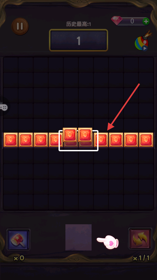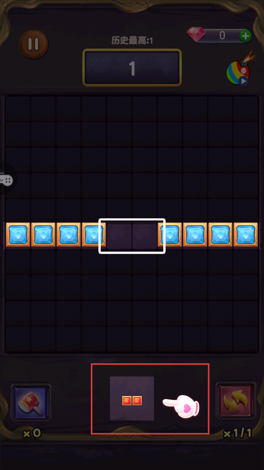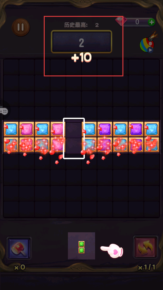 4、消除方块后,分数【+10】,历史最高更新为【2】,需优化放置策略,突破更高分数记录。