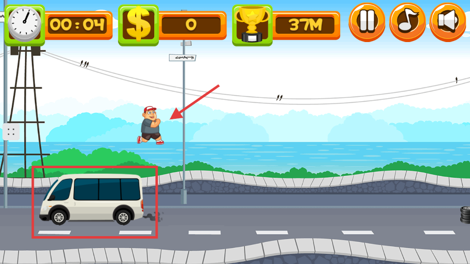 2、遇到道路车辆(如白色巴士)时,点击屏幕让角色跳跃闪避,避免碰撞导致失败。