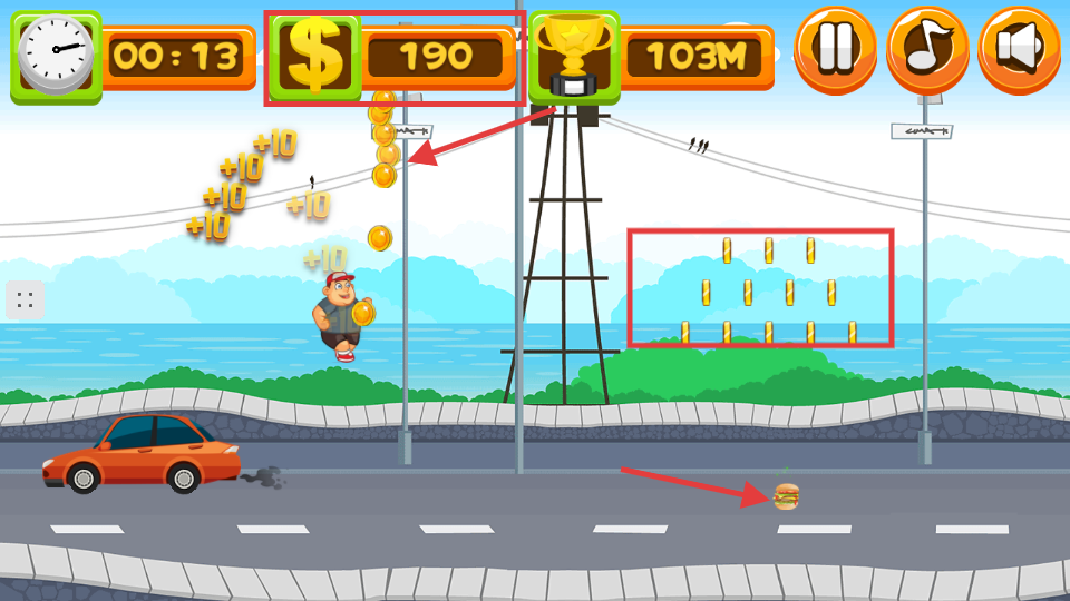 3、奔跑时优先拾取金币(单枚+10,成串更多)与汉堡,金币提分,汉堡触发特殊效果。