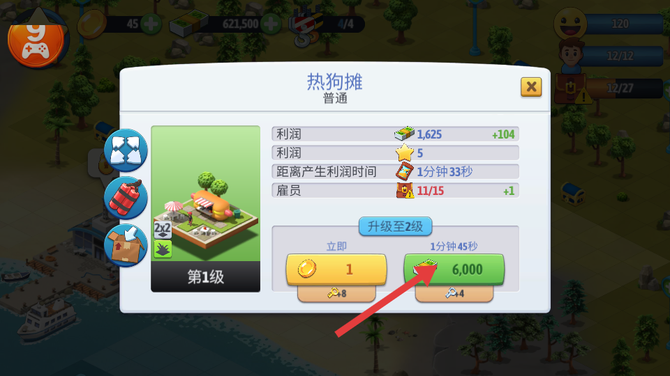 3、升级热狗摊至2级,增加利润和收益,提升岛屿经济。