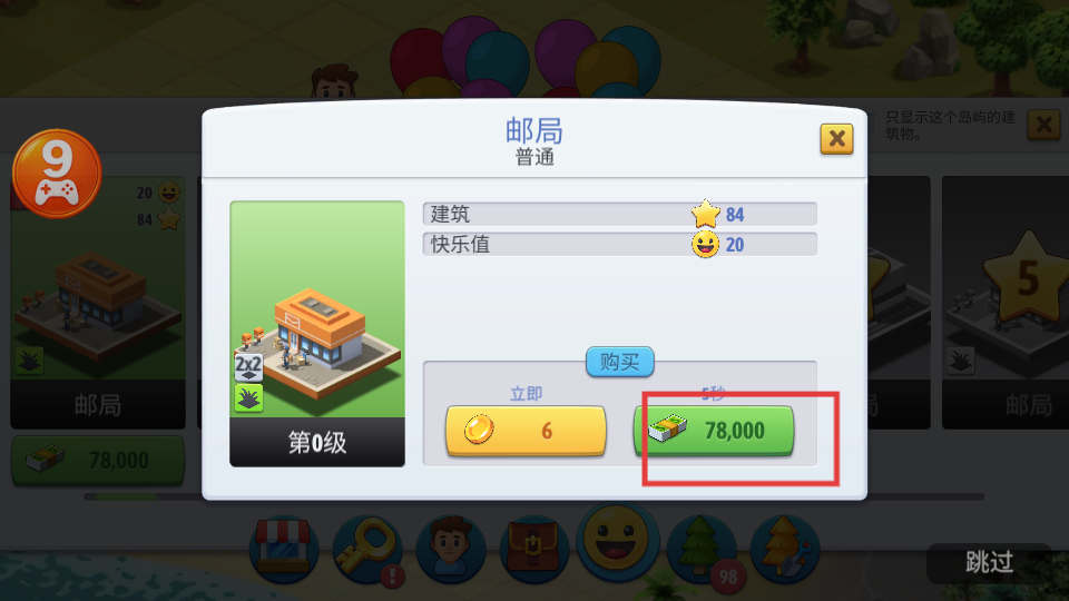 1、购买邮局,升建筑等级和快乐值,推进岛屿建设。