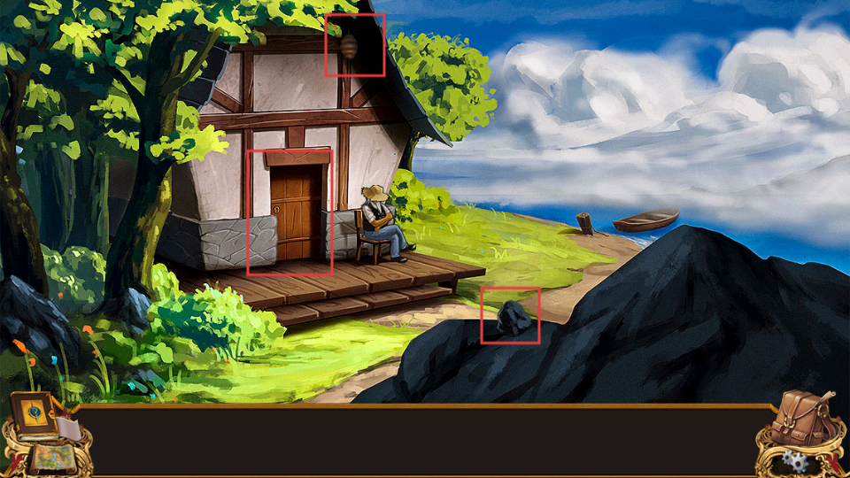 2、探索小屋区域,点击【门】【石头】【蜂窝】等互动点,尝试收集线索或触发剧情,推进调查。