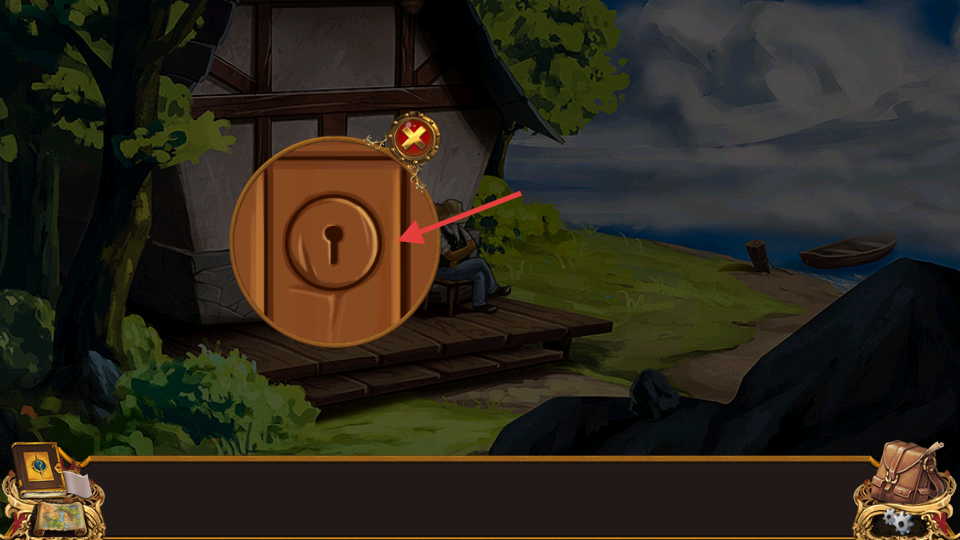 3、点击小屋【门】后出现锁孔,表明门需钥匙开启,需先在场景中寻找钥匙或替代开启物品。