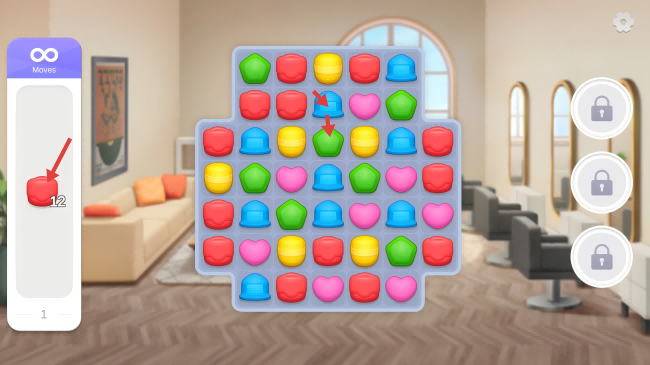 3、改造前需要消除关卡,通过移动不同形状的图标,进行消除,完成消除任务目标。