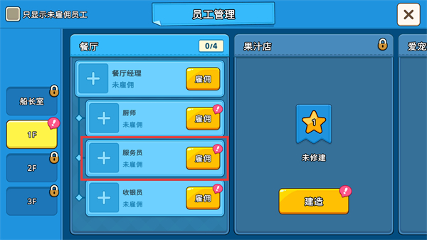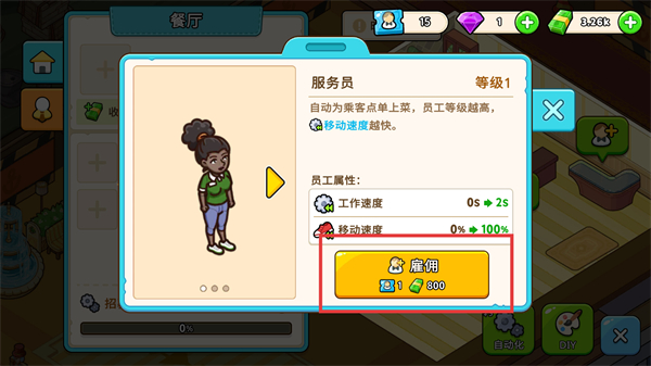 1、在员工管理界面找到餐厅的服务员选项,点击雇佣按钮来获取该员工。