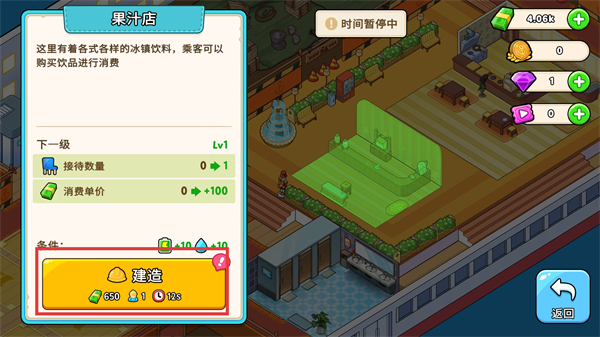 3、进入果汁店界面,满足条件后点击建造按钮。