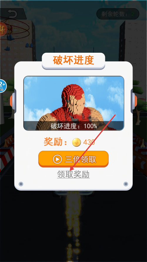 4、破坏进度达100%后,点击【领取奖励】,获取金币奖励。