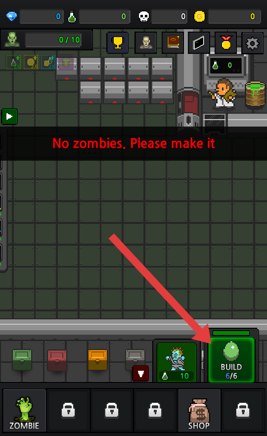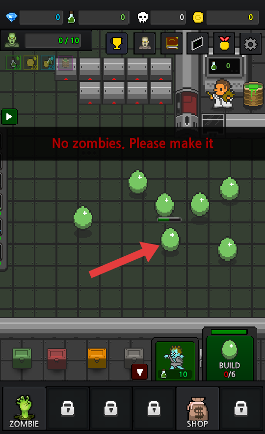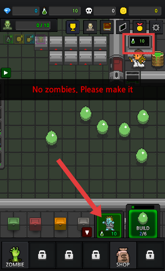 3、当上方红框内显示的【绿色液体】达到所需数量(如10)时,点击【僵尸】图标,消耗资源制造僵尸。