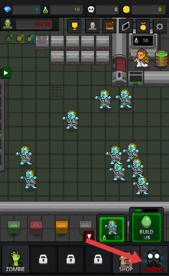4、成功制造出足够数量的僵尸(显示【10/10】)后,点击右下方【HUNTING】按钮,开启僵尸狩猎相关玩法。