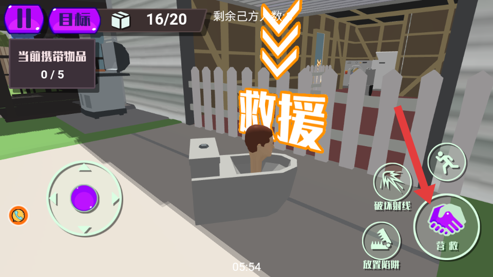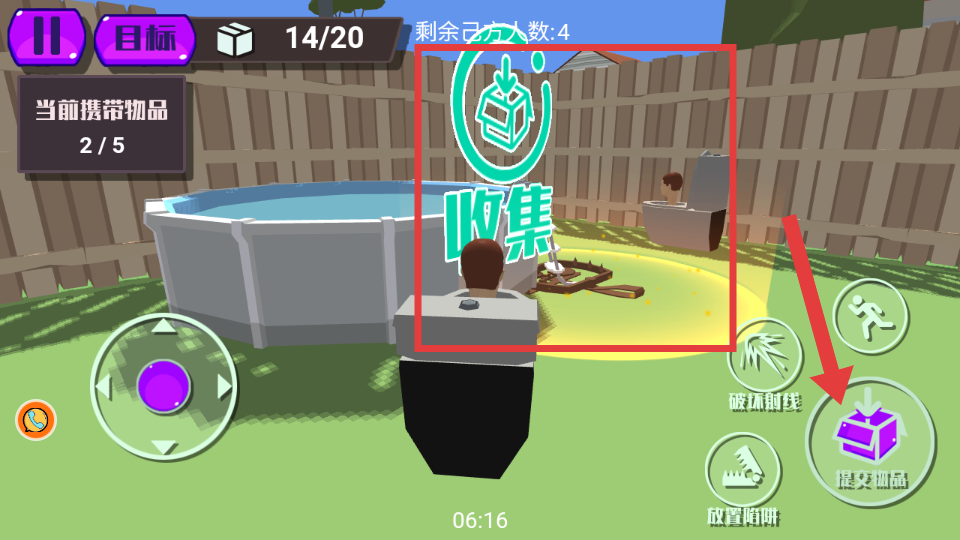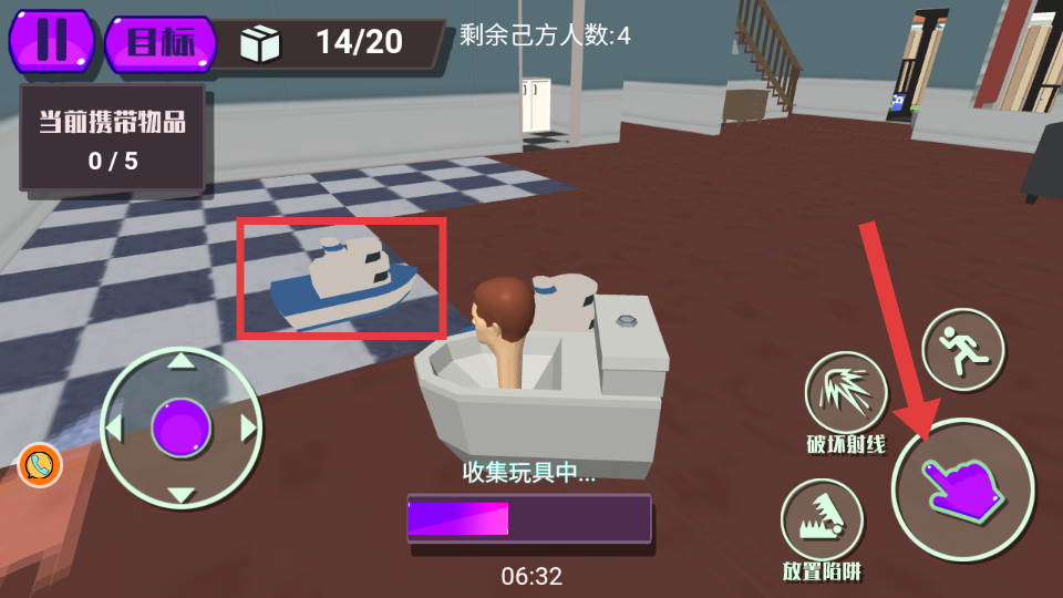2、进入游戏场景后,通过左侧虚拟摇杆移动角色,点击【紫色手指图标】收集【红框】内的玩具物品。