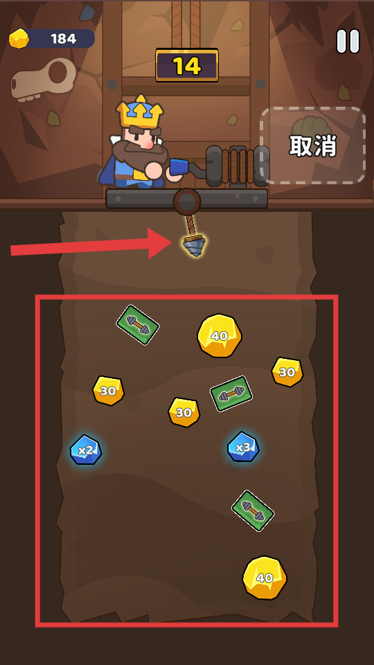 2、进入游戏后,操控角色使用工具挖掘【红框】内的矿石和道具,获取金币和资源。