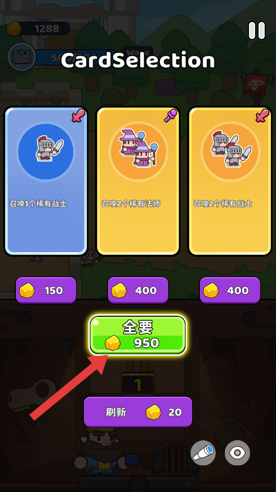 3、积累一定金币后,在【CardSelection】界面,点击【全要】按钮,选择并召唤战士、法师等战斗单位。