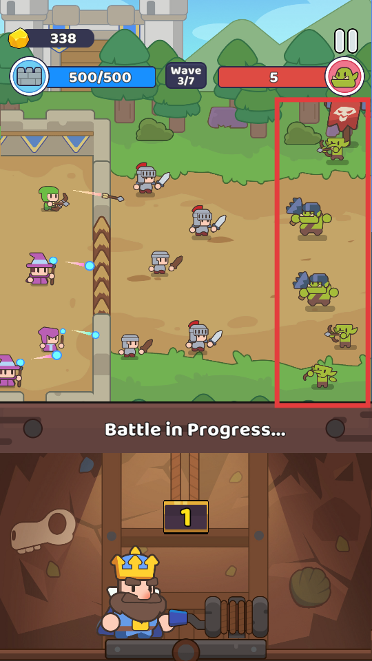 4、面对【红框】内的敌人进攻时,依靠召唤的战斗单位抵御敌人,守护城堡。