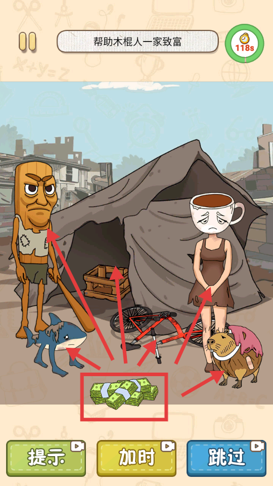 2、进入关卡后,将方框内【钞票】拖动至箭头所指的人物以及物体。