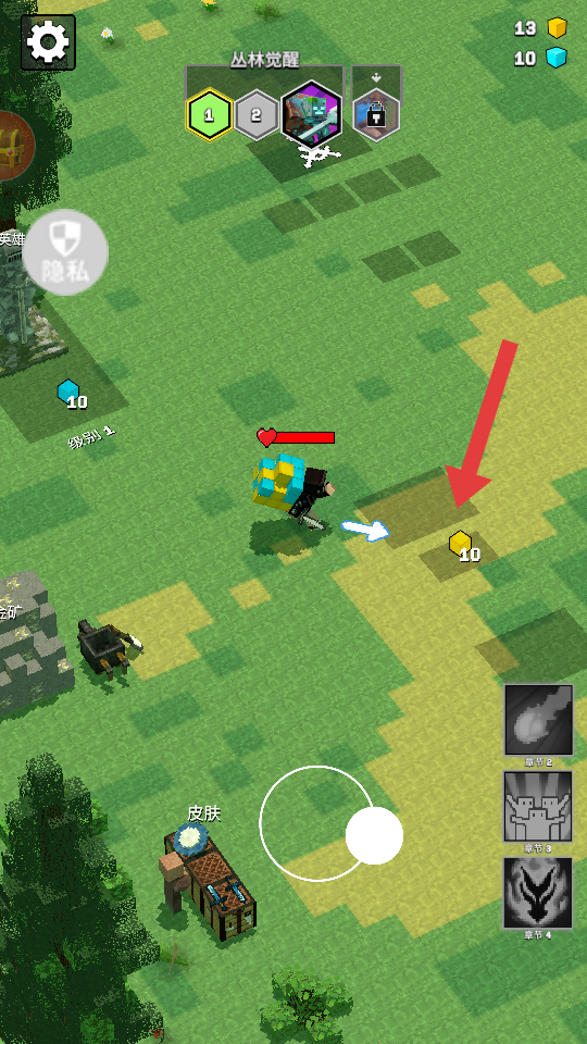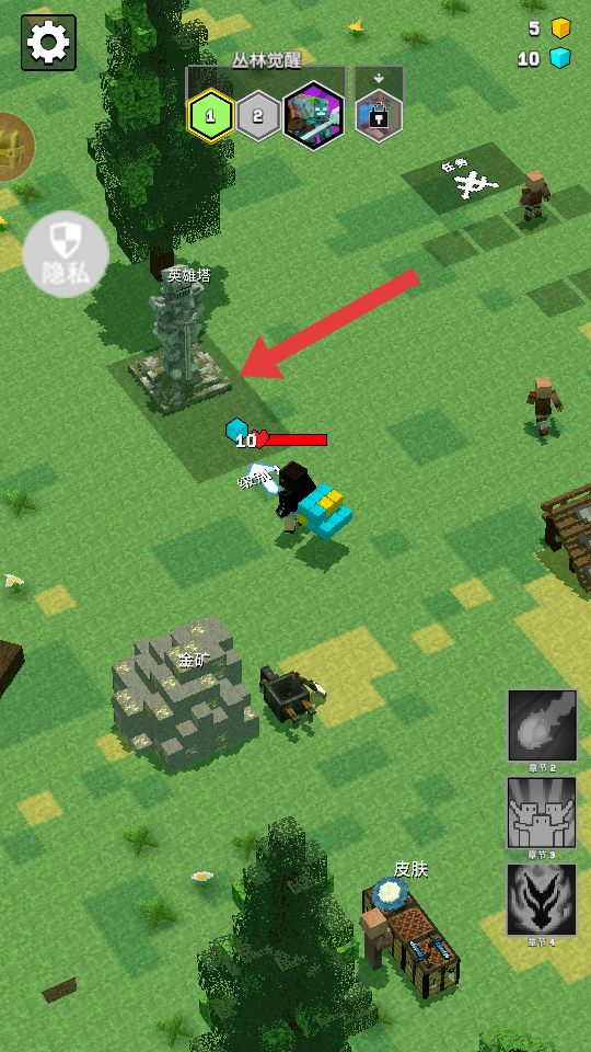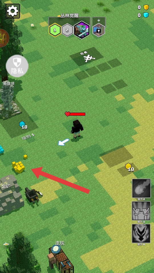 1、操控角色沿箭头方向移动,靠近【金矿】并收集黄色金矿资源,积累初始物资。