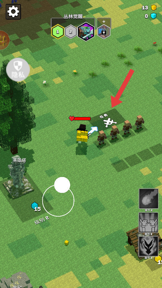 3、建造完兵营后,将角色移至箭头所指的【英雄塔】位置,借助其效果增强角色的战斗能力。