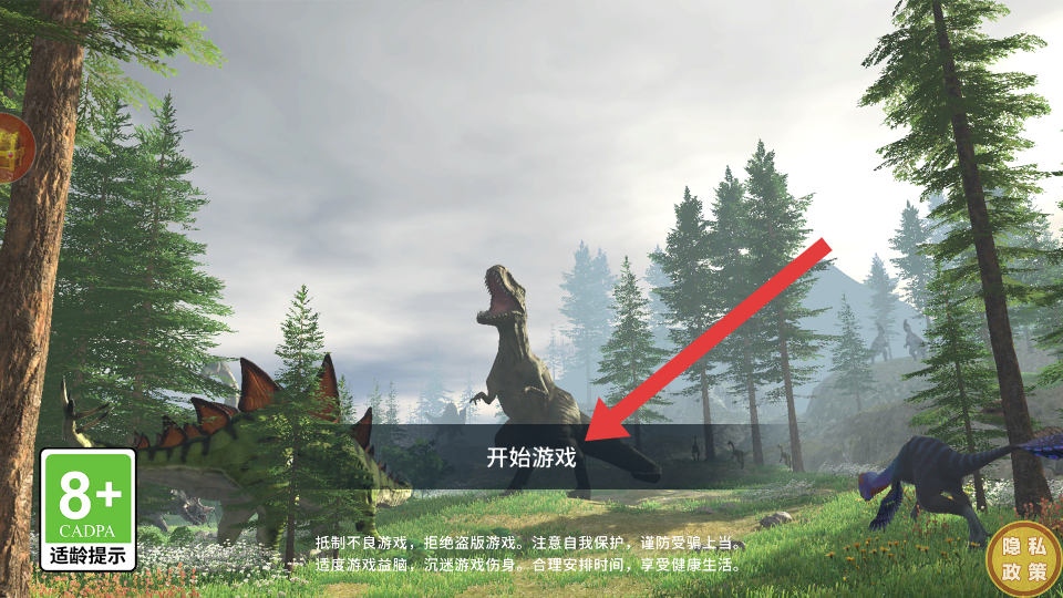 1、进入游戏初始界面,点击【开始游戏】按钮,正式开启恐龙生存冒险之旅。