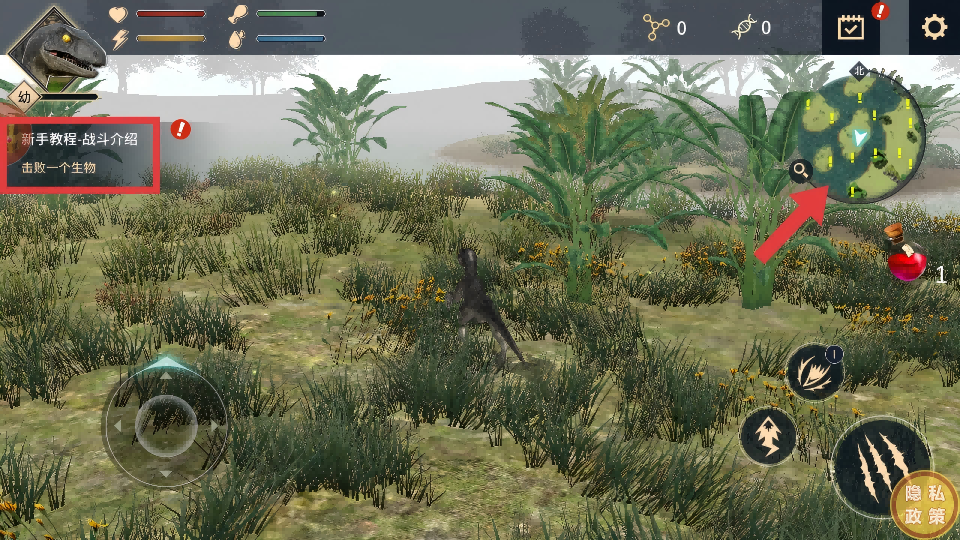 2、进入游戏场景,留意左侧【新手教程-战斗介绍-击败一个生物】任务提示,通过右上角小地图寻找目标生物。