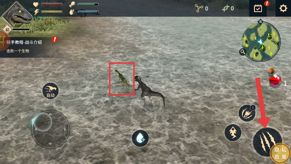 3、发现如红框内的生物后,点击屏幕右下角【爪子】的攻击按钮,操控自己的恐龙对目标发起攻击。