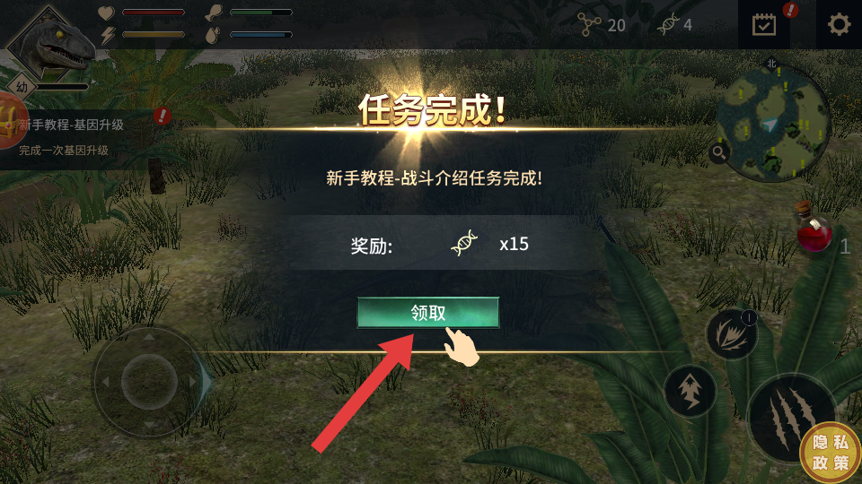 4、成功击败生物完成任务,出现【任务完成!】提示后,点击【领取】获得奖励。