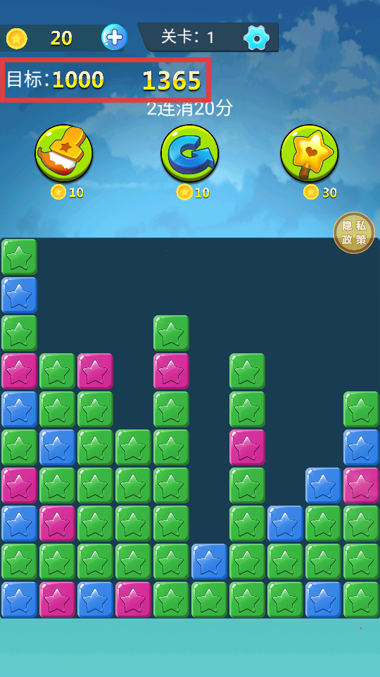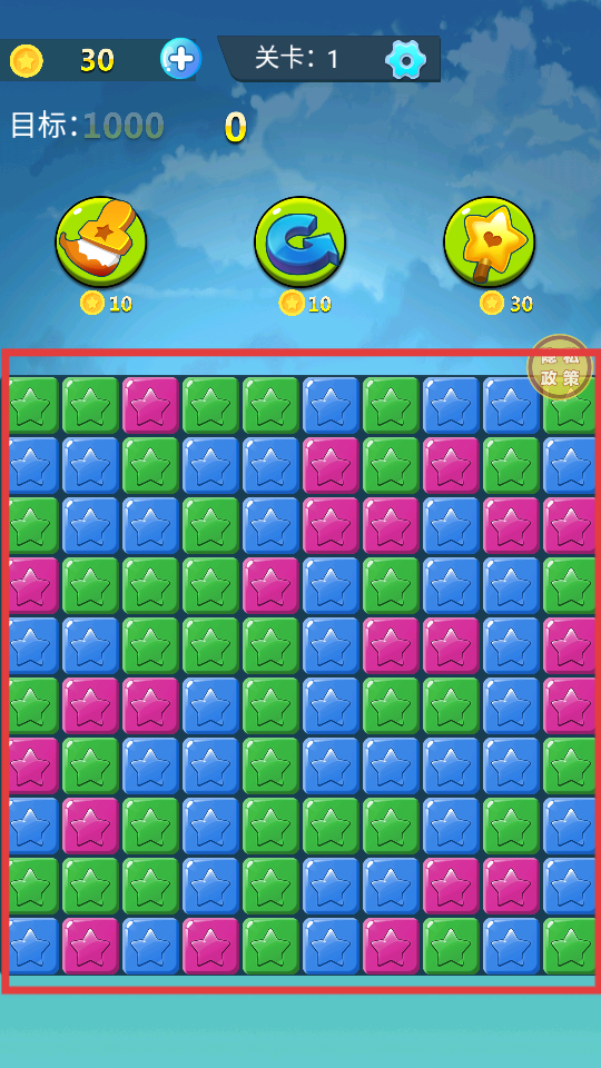 2、进入【关卡1】,查看界面上方的【目标:1000】分数要求,通过点击交换【红框】内相邻的同色星星方块,进行消除操作。