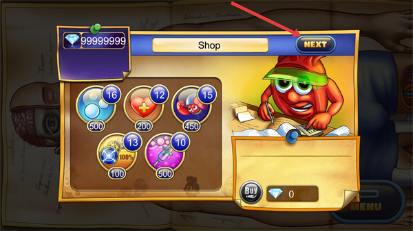 1、在商店界面点击【NEXT】按钮,跳过道具选购,进入防御关卡的游戏场景。