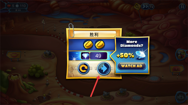 4、关卡胜利后获得【49钻石】奖励,点击箭头按钮进入下一个防御关卡继续挑战。