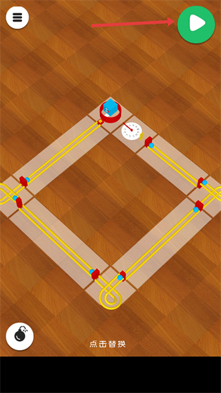 4、点击上方绿色播放按钮启动骨牌,观察线路上的机关触发,可通过【点击替换】调整布局,确保流程顺畅。