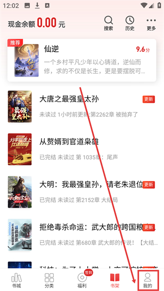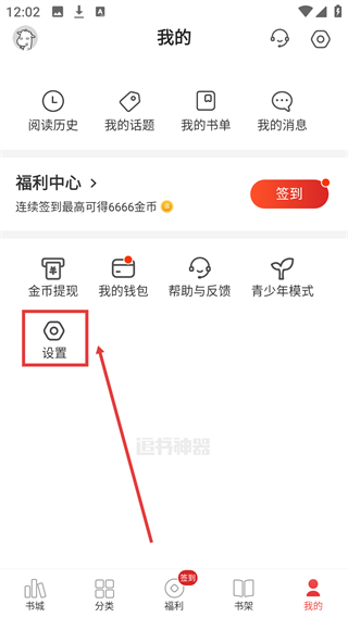 1、进入书架页面,点击底部【我的】选项,可进入个人中心页面,该页面包含阅读相关功能及账户设置入口。