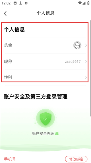 4、进入【个人信息】页面,可查看并编辑【头像】【昵称】【性别】等信息。