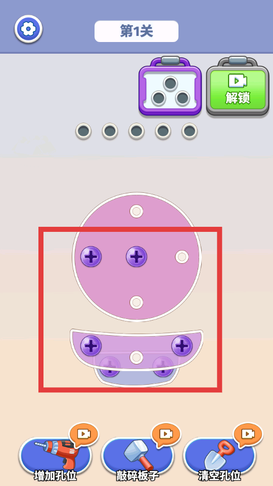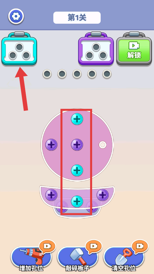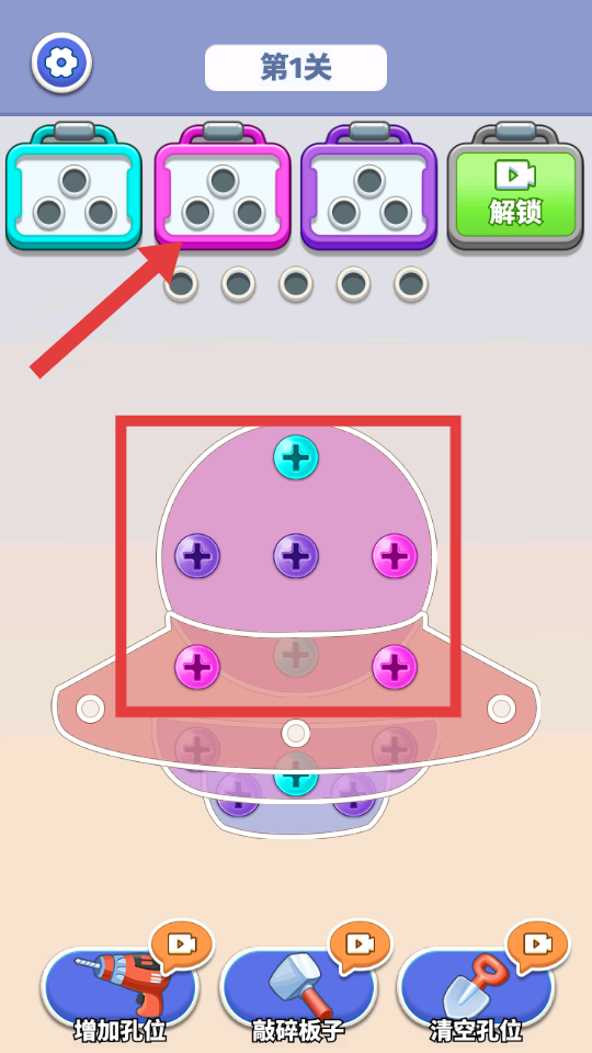 1、进入【第1关】,观察界面,点击方框内【粉色螺丝】将其消除。