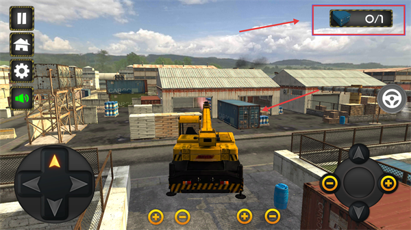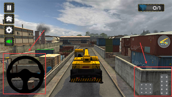 3、游戏内用左侧【方向盘】控制起重机移动方向,去往任务地点。
