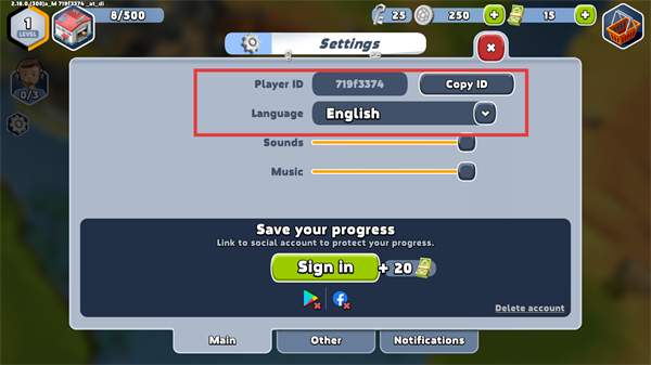 1、可在设置界面查看玩家ID同时可调整语言、声音和音乐的设置。
