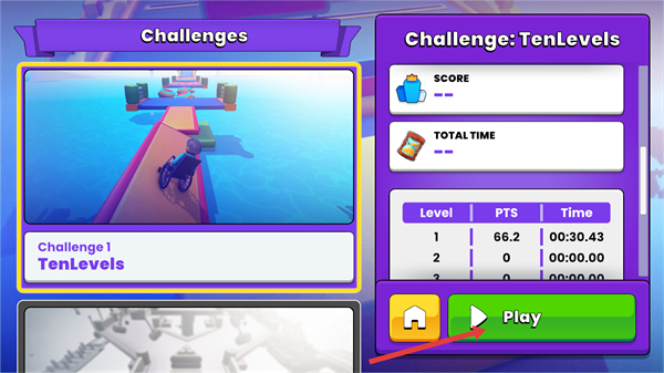 1、在【Challenges】界面选择【Challenge-1-TenLevels】,点击【Play】按钮进入关卡,开启多关卡挑战。