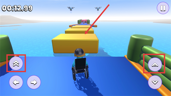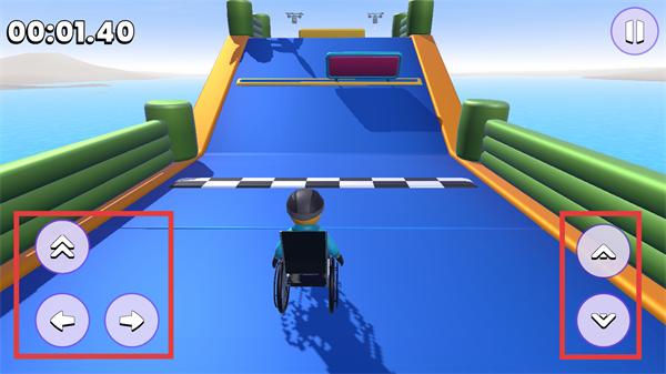 2、操控红框内的方向键控制轮椅,快速通过起点区域的赛道,利用斜坡加速推进关卡进度。