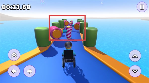 4、操控轮椅穿过红框内的彩色障碍物区域,避开障碍的同时保持前进,推进关卡的完成进度。