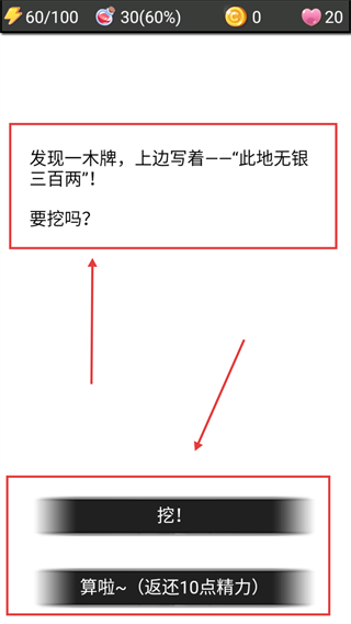 2、遇到写有“此地无银三百两”的木牌时,选择挖取可能获得隐藏资源,不过会消耗精力,需权衡当前状态。