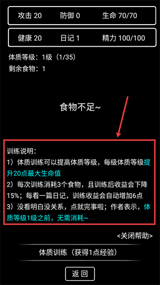 4、体质训练消耗食物,1级前无需消耗,每看一篇日记可增加训练收益,提升体质等级增强生存能力。